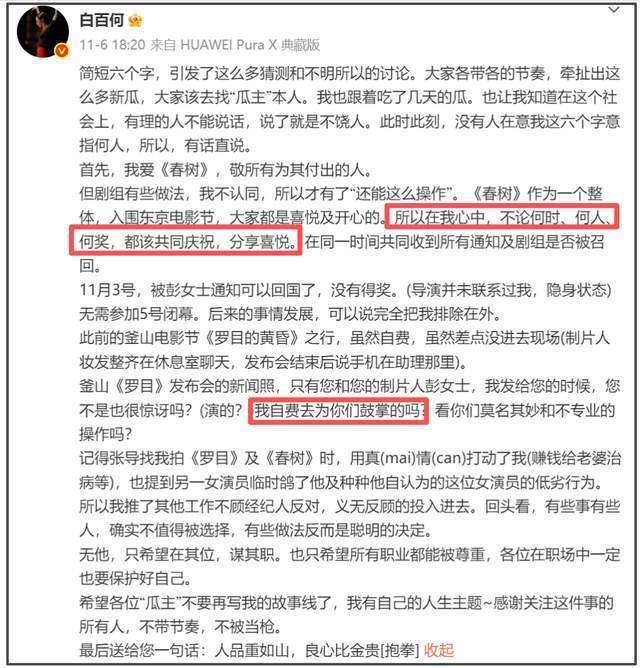 然后到了东京电影节,有了白百何釜山的操作,估计制片人觉得,她没有个人奖的话,就不会陪剧组出席活动了,毕竟釜山是电影得奖,她都不愿意出现,那东京属于导演和演员是个人奖,她大概率也不会出席了,所以按照白百何的要求,跟她的经纪团队沟通,通知她可以回去了。结果没一会儿,白百何自己发了一条“还能这样操作”的微博,开始内涵剧组孤立她,不跟她本人沟通。