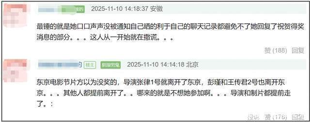 难怪网友质疑白百何在找补,认为本质是她没得奖,所以在发泄不满。实际上导演在内的所有人都不知道会不会得奖,所以很多人提前都离开了,只有她还在东京等消息,等𳗣日晚上才出通知,有些临时赶回来,有些取消航班,白百何等了几天没得奖,反而是挂件男主王传君得奖了,她可能也是受到冲击,于是用“过河拆桥 ”表达不满。