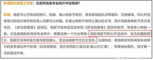 而片方则完全懵圈,因为根据他们的说法,新闻照是主办方选择的,无需向他们确认。他们完全没想到白百何会在意这一点,所以不知道白百何有气在这里的情况下,制片人面对白百何冷冰冰地一句“找我经纪人”,估计也很难受,所以东京电影节想当然地没想到邀请她。