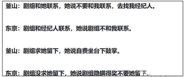 从片方的视角看,釜山电影节是影片得奖了,属于主创的集体荣耀,片方邀请女主角白百何她却没出席,到了东京电影节,她却愿意出席了,变来变去,还要指控片方孤立她,这怎么看都很错愕。包括白百何自己发文也很矛盾,她说希望共同庆祝分享喜悦,转头又说“我自费去给你们鼓掌吗”?所以她自己到底是愿不愿意分享喜悦鼓掌呢?